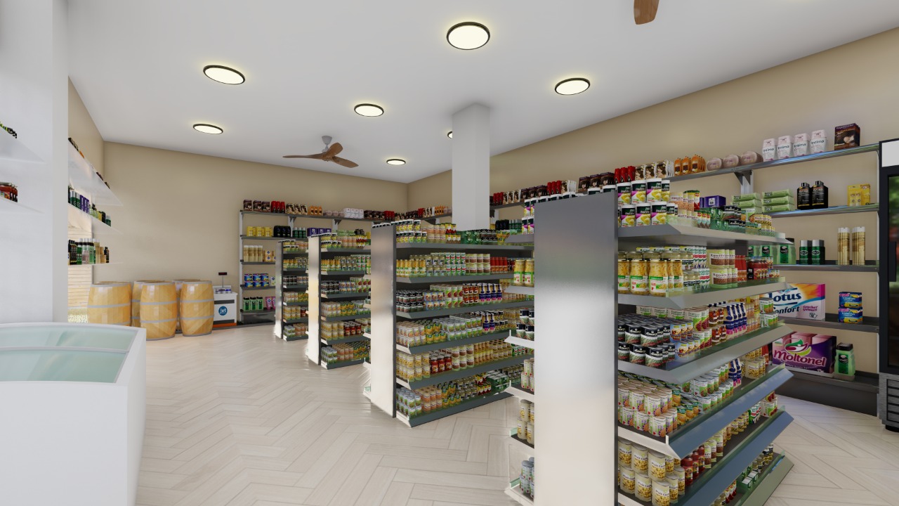 A Multiutility store designed in a cramped up space to maximize the space, showcasing vertical planning along the regular horizontal setups.
